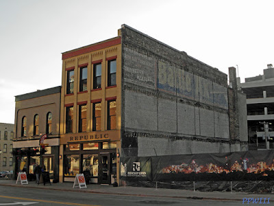 Once demolished, some 100+ year old signage for Battle Ax Tobacco was visible on the side of the building housing Republic next door!